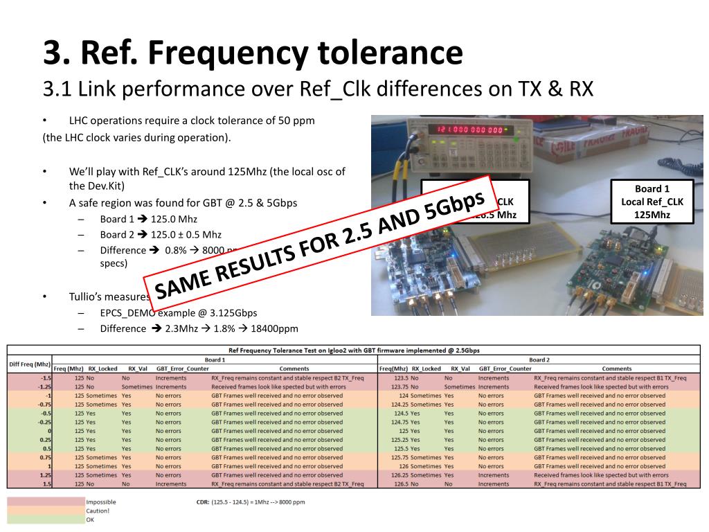 3. Ref. Frequency tolerance3.1 Link performance over Ref_Clk differences on TX & RX • LHC operations require a clock tolerance of 50 ppm (the LHC clock varies during operation). • We’ll play with Ref_CLK’s around 125Mhz (the local osc of the Dev.Kit) • A safe region was found for GBT @ 2.5 & 5Gbps • Board 1 125.0 Mhz • Board 2 125.0 ± 0.5 Mhz • Difference 0.8% 8000 ppm >> 50 ppm (we met the specs) • Tullio’s measures • EPCS_DEMO example @ 3.125Gbps • Difference 2.3Mhz 1.8% 18400ppm Board 2 Variable Ref_CLK 123.5 – 126.5 Mhz Board 1 Local Ref_CLK 125Mhz SAME RESULTS FOR 2.5 AND 5Gbps