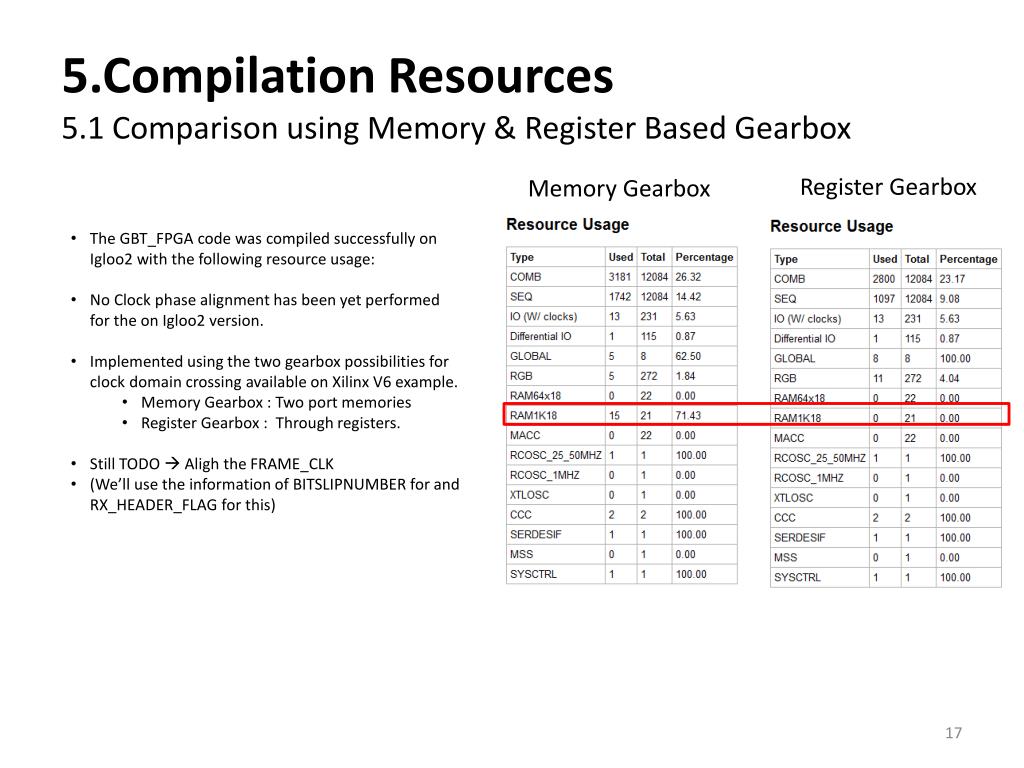 5.Compilation Resources5.1 Comparison using Memory & Register Based Gearbox Register Gearbox Memory Gearbox • The GBT_FPGA code was compiled successfully on Igloo2 with the following resource usage: • No Clock phase alignment has been yet performed for the on Igloo2 version. • Implemented using the two gearbox possibilities for clock domain crossing available on Xilinx V6 example. • Memory Gearbox : Two port memories • Register Gearbox : Through registers. • Still TODO Aligh the FRAME_CLK • (We’ll use the information of BITSLIPNUMBER for and RX_HEADER_FLAG for this)