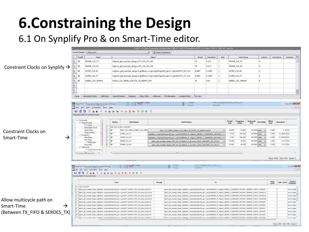 6.Constraining the Design6.1 On Synplify Pro & on Smart-Time editor. Constraint Clocks on Synplify Constraint Clocks on Smart-Time Allow multicycle path on Smart-Time (Between TX_FIFO & SERDES_TX)
