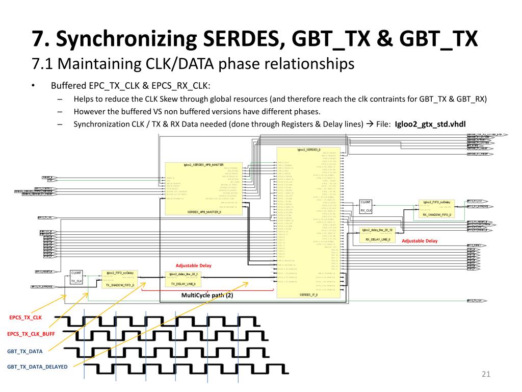7. Synchronizing SERDES, GBT_TX & GBT_TX7.1 Maintaining CLK/DATA phase relationships • Buffered EPC_TX_CLK & EPCS_RX_CLK: • Helps to reduce the CLK Skew through global resources (and therefore reach the clkcontraints for GBT_TX & GBT_RX) • However the buffered VS non buffered versions have different phases. • Synchronization CLK / TX & RX Data needed (done through Registers & Delay lines) File: Igloo2_gtx_std.vhdl Adjustable Delay Adjustable Delay MultiCycle path (2)