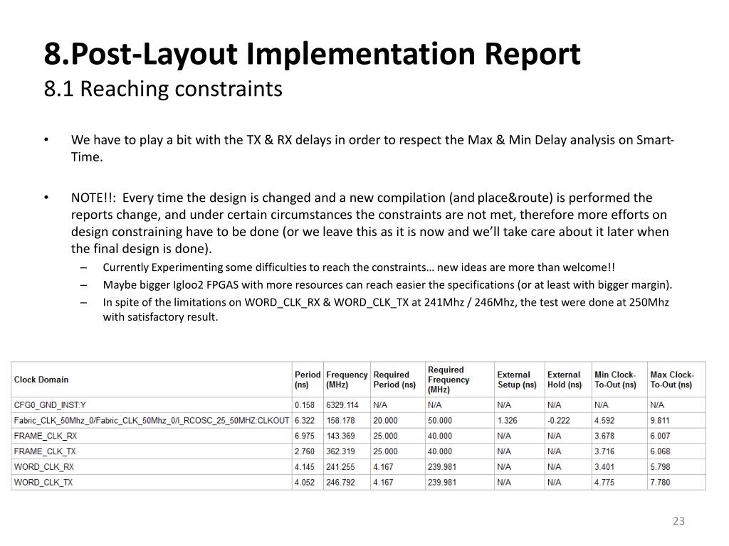 8.Post-Layout Implementation Report8.1 Reaching constraints • We have to play a bit with the TX & RX delays in order to respect the Max & Min Delay analysis on Smart-Time. • NOTE!!: Every time the design is changed and a new compilation (and place&route) is performed the reports change, and under certain circumstances the constraints are not met, therefore more efforts on design constraining have to be done (or we leave this as it is now and we’ll take care about it later when the final design is done). • Currently Experimenting some difficulties to reach the constraints… new ideas are more than welcome!! • Maybe bigger Igloo2 FPGAS with more resources can reach easier the specifications (or at least with bigger margin). • In spite of the limitations on WORD_CLK_RX & WORD_CLK_TX at 241Mhz / 246Mhz, the test were done at 250Mhz with satisfactory result.