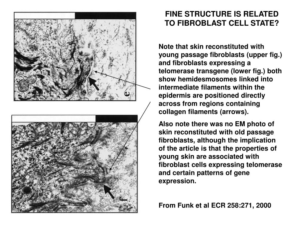 FINE STRUCTURE IS RELATED TO FIBROBLAST CELL STATE? Note that skin reconstituted with young passage fibroblasts (upper fig.) and fibroblasts expressing a telomerase transgene (lower fig.) both show hemidesmosomes linked into intermediate filaments within the epidermis are positioned directly across from regions containing collagen filaments (arrows). Also note there was no EM photo of skin reconstituted with old passage fibroblasts, although the implication of the article is that the properties of young skin are associated with fibroblast cells expressing telomerase and certain patterns of gene expression. From Funk et al ECR 258:271, 2000