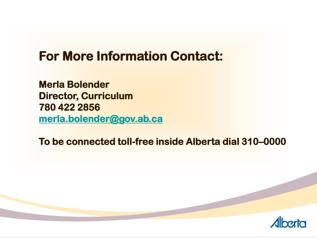For More Information Contact: Merla Bolender Director, Curriculum 780 422 2856 merla.bolender@gov.ab.ca To be connected toll-free inside Alberta dial 310–0000