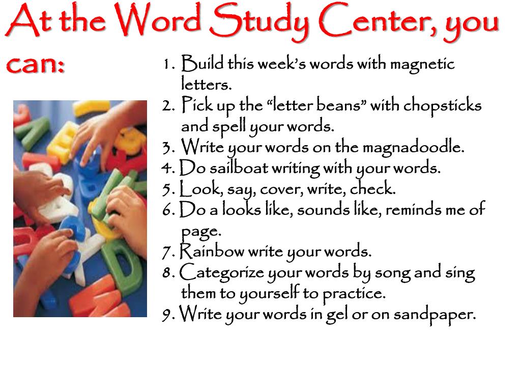 At the Word Study Center, you can: • Build this week’s words with magnetic letters. • Pick up the “letter beans” with chopsticks and spell your words. • Write your words on the magnadoodle. • 4. Do sailboat writing with your words. • 5. Look, say, cover, write, check. • 6. Do a looks like, sounds like, reminds me of page. • 7. Rainbow write your words. • 8. Categorize your words by song and sing them to yourself to practice. • 9. Write your words in gel or on sandpaper.