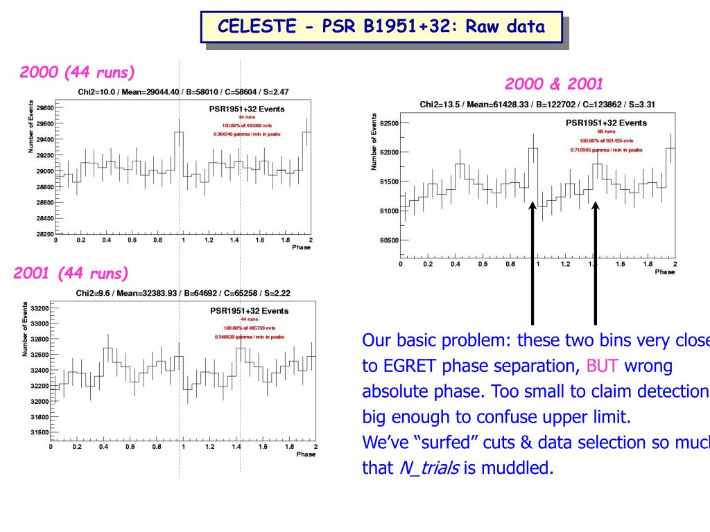 CELESTE - PSR B1951+32: Raw data 2000 (44 runs) 2000 & 2001 2001 (44 runs) Our basic problem: these two bins very close to EGRET phase separation, BUT wrong absolute phase. Too small to claim detection, big enough to confuse upper limit. We’ve “surfed” cuts & data selection so much that N_trials is muddled.