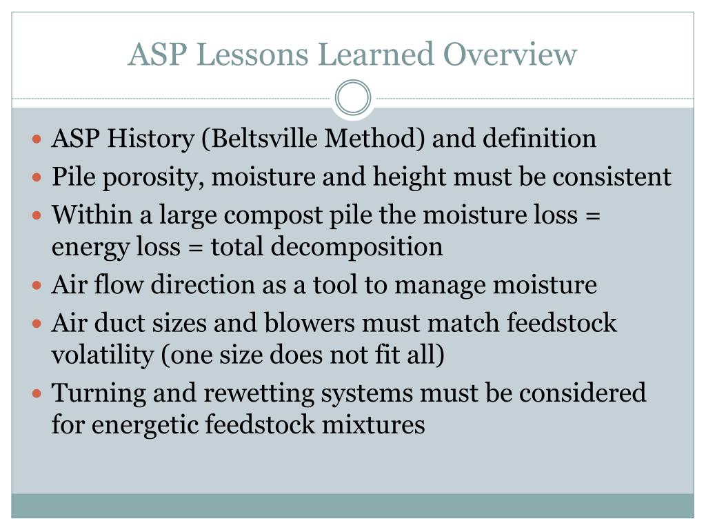 ASP Lessons Learned Overview ASP History (Beltsville Method) and definition Pile porosity, moisture and height must be consistent Within a large compost pile the moisture loss = energy loss = total decomposition Air flow direction as a tool to manage moisture Air duct sizes and blowers must match feedstock volatility (one size does not fit all) Turning and rewetting systems must be considered for energetic feedstock mixtures