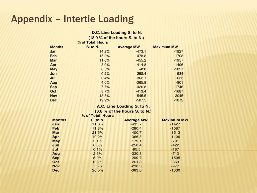The Interties The average physical transfer capability* on the A.C. line S. to N. is 3,100 MW [Genesys 4880] The average physical transfer capability* on the D.C. line S. to N. is 1,700 MW [Genesys 2850] Flows on the A.C. line were S. to N. 3.8% of the time with an average flow of 346 MW and a maximum of 1,513 MW Flows on the D.C. line were S. to N. 18.9% of the time with an average flow of 472 MW and a maximum of 2,045 MW The maximum coincidental import on both lines was 2,810 MW *A.C. rated at 4,800 MW; average includes line de-rates (Dec 2004 to Dec 2009)