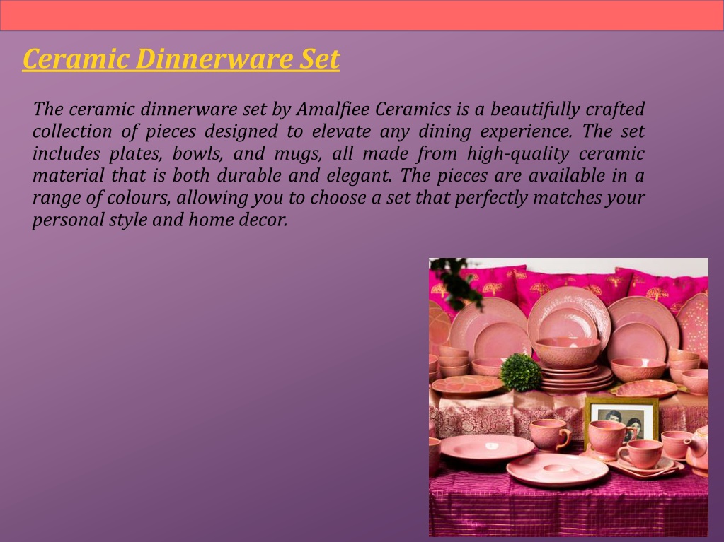 Ceramic Dinnerware Set The ceramic dinnerware set by Amalfiee Ceramics is a beautifully crafted collection of pieces designed to elevate any dining experience. The set includes plates, bowls, and mugs, all made from high-quality ceramic material that is both durable and elegant. The pieces are available in a range of colours, allowing you to choose a set that perfectly matches your personal style and home decor.