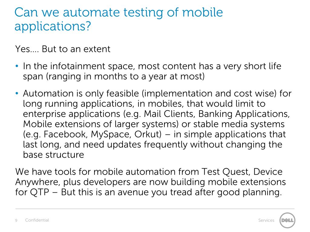 Can we automate testing of mobile applications? Yes…. But to an extent • In the infotainment space, most content has a very short life span (ranging in months to a year at most) • Automation is only feasible (implementation and cost wise) for long running applications, in mobiles, that would limit to enterprise applications (e.g. Mail Clients, Banking Applications, Mobile extensions of larger systems) or stable media systems (e.g. Facebook, MySpace, Orkut) – in simple applications that last long, and need updates frequently without changing the base structure We have tools for mobile automation from Test Quest, Device Anywhere, plus developers are now building mobile extensions for QTP – But this is an avenue you tread after good planning. Confidential