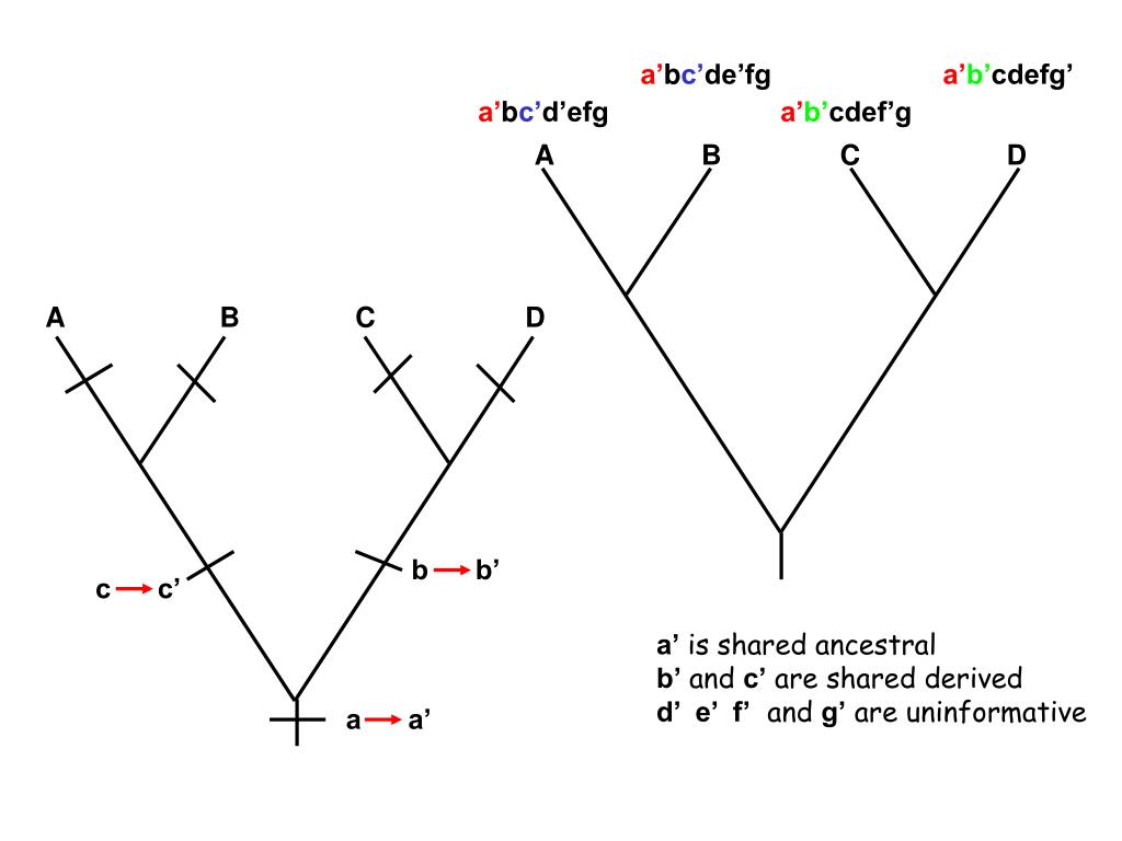 a’bc’de’fg a’b’cdefg’ a’bc’d’efg a’b’cdef’g A B C D A B C D b b’ c c’ a’is shared ancestral b’and c’ are shared derived d’ e’ f’ and g’ are uninformative a a’