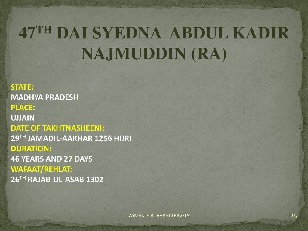 47TH DAI SYEDNA ABDUL KADIR NAJMUDDIN (RA) STATE: MADHYA PRADESH PLACE: UJJAIN DATE OF TAKHTNASHEENI: 29TH JAMADIL-AAKHAR 1256 HIJRI DURATION: 46 YEARS AND 27 DAYS WAFAAT/REHLAT: 26TH RAJAB-UL-ASAB 1302 ZAMAN-E-BURHANI TRAVELS