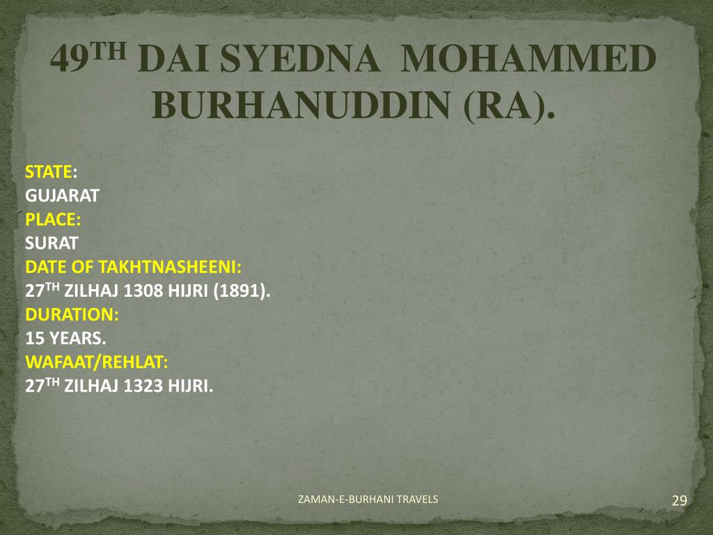 49TH DAI SYEDNA MOHAMMED BURHANUDDIN (RA). STATE: GUJARAT PLACE: SURAT DATE OF TAKHTNASHEENI: 27TH ZILHAJ 1308 HIJRI (1891). DURATION: 15 YEARS. WAFAAT/REHLAT: 27TH ZILHAJ 1323 HIJRI. ZAMAN-E-BURHANI TRAVELS