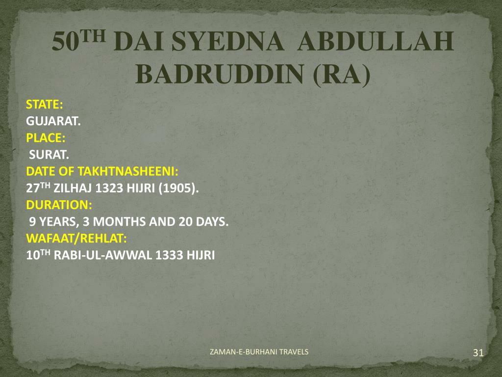 50TH DAI SYEDNA ABDULLAH BADRUDDIN (RA) STATE: GUJARAT. PLACE: SURAT. DATE OF TAKHTNASHEENI: 27TH ZILHAJ 1323 HIJRI (1905). DURATION: 9 YEARS, 3 MONTHS AND 20 DAYS. WAFAAT/REHLAT: 10TH RABI-UL-AWWAL 1333 HIJRI ZAMAN-E-BURHANI TRAVELS