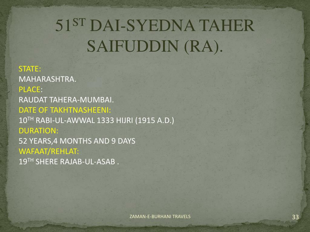 51ST DAI-SYEDNA TAHER SAIFUDDIN (RA). STATE: MAHARASHTRA. PLACE: RAUDAT TAHERA-MUMBAI. DATE OF TAKHTNASHEENI: 10TH RABI-UL-AWWAL 1333 HIJRI (1915 A.D.) DURATION: 52 YEARS,4 MONTHS AND 9 DAYS WAFAAT/REHLAT: 19TH SHERE RAJAB-UL-ASAB . ZAMAN-E-BURHANI TRAVELS