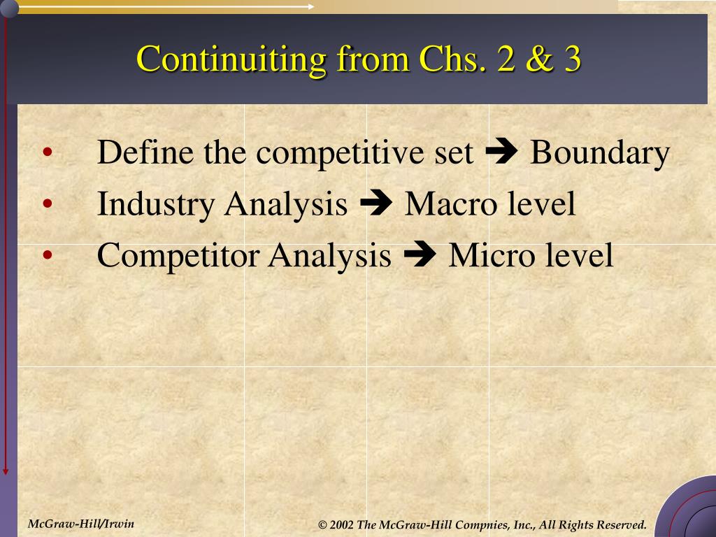 Continuiting from Chs. 2 & 3 • Define the competitive set Boundary • Industry Analysis Macro level • Competitor Analysis Micro level
