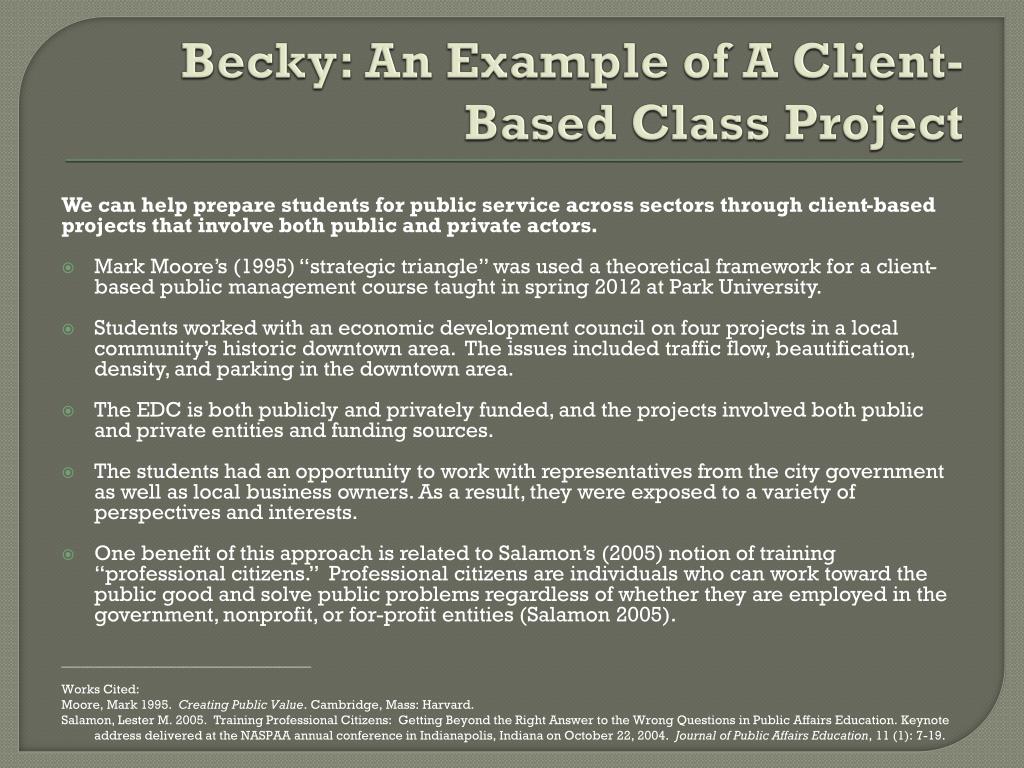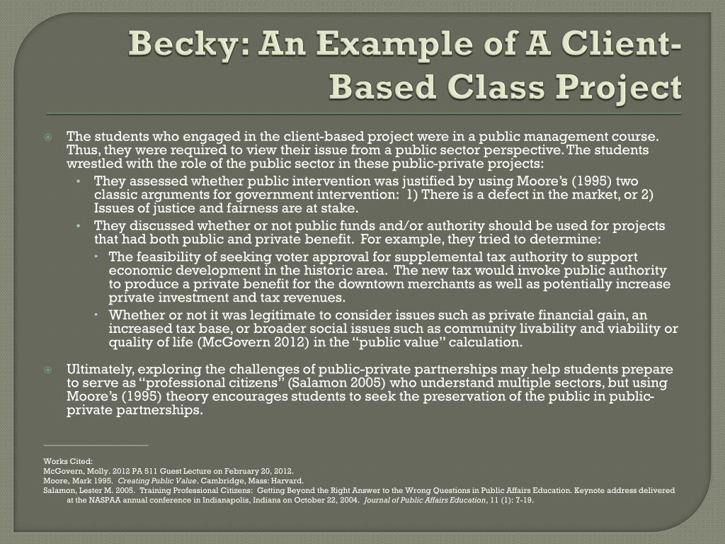 Becky: An Example of A Client-Based Class Project • The students who engaged in the client-based project were in a public management course. Thus, they were required to view their issue from a public sector perspective. The students wrestled with the role of the public sector in these public-private projects: • They assessed whether public intervention was justified by using Moore’s (1995) two classic arguments for government intervention: 1) There is a defect in the market, or 2) Issues of justice and fairness are at stake. • They discussed whether or not public funds and/or authority should be used for projects that had both public and private benefit. For example, they tried to determine: • The feasibility of seeking voter approval for supplemental tax authority to support economic development in the historic area. The new tax would invoke public authority to produce a private benefit for the downtown merchants as well as potentially increase private investment and tax revenues. • Whether or not it was legitimate to consider issues such as private financial gain, an increased tax base, or broader social issues such as community livability and viability or quality of life (McGovern 2012) in the “public value” calculation. • Ultimately, exploring the challenges of public-private partnerships may help students prepare to serve as “professional citizens” (Salamon 2005) who understand multiple sectors, but using Moore’s (1995) theory encourages students to seek the preservation of the public in public-private partnerships. __________________________ Works Cited: McGovern, Molly. 2012 PA 511 Guest Lecture on February 20, 2012. Moore, Mark 1995. Creating Public Value. Cambridge, Mass: Harvard. Salamon, Lester M. 2005. Training Professional Citizens: Getting Beyond the Right Answer to the Wrong Questions in Public Affairs Education. Keynote address delivered at the NASPAA annual conference in Indianapolis, Indiana on October 22, 2004. Journal of Public Affairs Education, 11 (1): 7-19.
