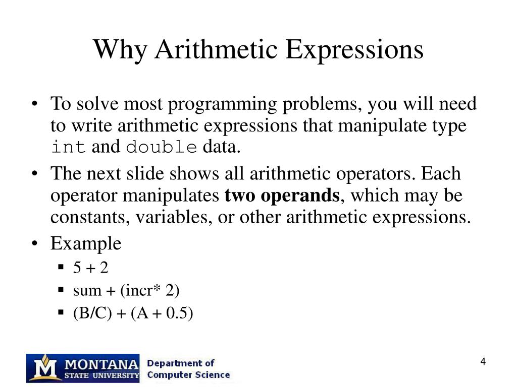 Why Arithmetic Expressions • To solve most programming problems, you will need to write arithmetic expressions that manipulate type int and double data. • The next slide shows all arithmetic operators. Each operator manipulates two operands, which may be constants, variables, or other arithmetic expressions. • Example • 5 + 2 • sum + (incr* 2) • (B/C) + (A + 0.5)