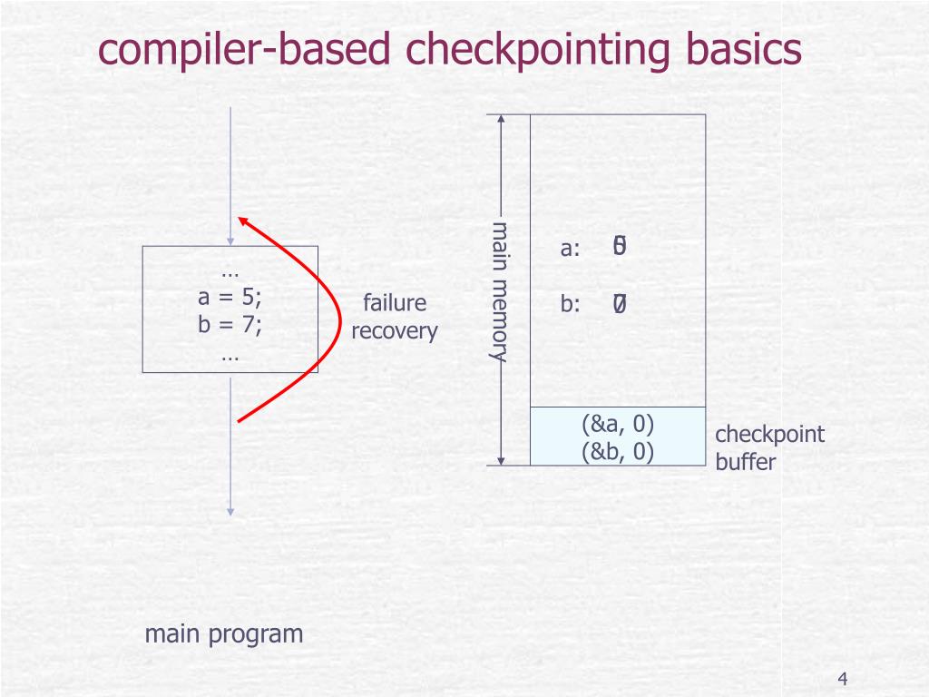 compiler-based checkpointing basics a: b: main memory 0 5 … a = 5; b = 7; … 0 7 failure recovery (&a, 0) (&b, 0) checkpoint buffer main program