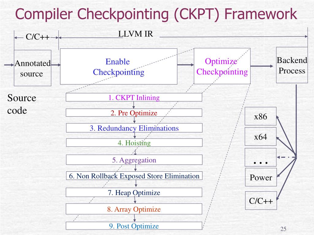 Compiler Checkpointing (CKPT) Framework LLVM IR C/C++ Backend Process Optimize Checkpointing Enable Checkpointing Annotated source Source code 1. CKPT Inlining x86 2. Pre Optimize 3. Redundancy Eliminations x64 4. Hoisting … 5. Aggregation Power 6. Non Rollback Exposed Store Elimination 7. Heap Optimize C/C++ 8. Array Optimize 9. Post Optimize