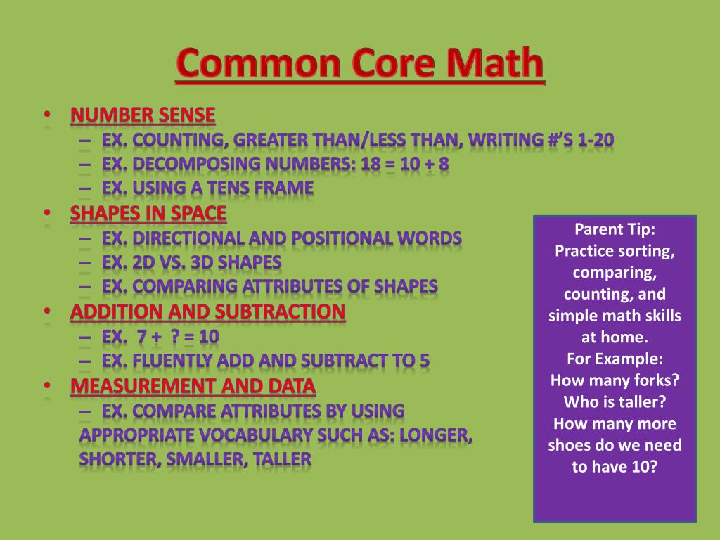 Common Core Math • Number Sense • Ex. Counting, greater than/less than, writing #’s 1-20 • Ex. Decomposing numbers: 18 = 10 + 8 • Ex. Using a tens frame • Shapes in Space • Ex. Directional and positional words • Ex. 2d vs. 3d shapes • Ex. Comparing attributes of shapes • Addition and Subtraction • Ex. 7 + ? = 10 • Ex. Fluently add and subtract to 5 • Measurement and Data • Ex. Compare attributes by using appropriate vocabulary such as: longer, shorter, smaller, taller Parent Tip: Practice sorting, comparing, counting, and simple math skills at home. For Example: How many forks? Who is taller? How many more shoes do we need to have 10?