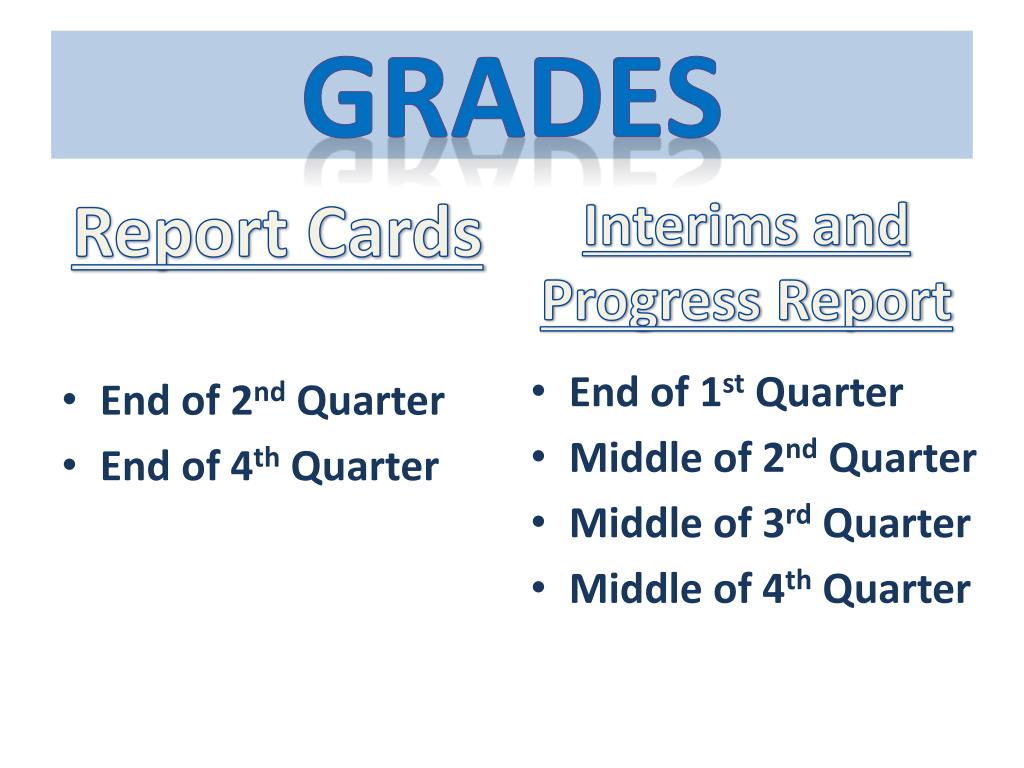 Grades Report Cards Interims and Progress Report End of 1st Quarter Middle of 2nd Quarter Middle of 3rd Quarter Middle of 4th Quarter • End of 2nd Quarter • End of 4th Quarter