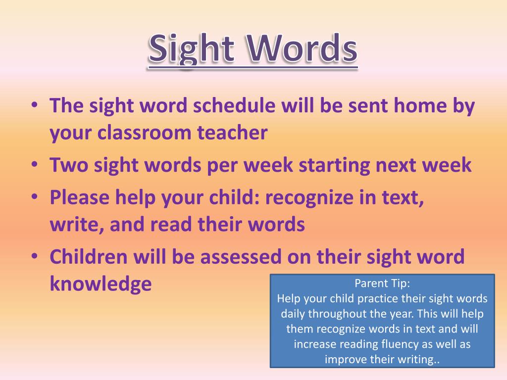 Sight Words • The sight word schedule will be sent home by your classroom teacher • Two sight words per week starting next week • Please help your child: recognize in text, write, and read their words • Children will be assessed on their sight word knowledge Parent Tip: Help your child practice their sight words daily throughout the year. This will help them recognize words in text and will increase reading fluency as well as improve their writing..