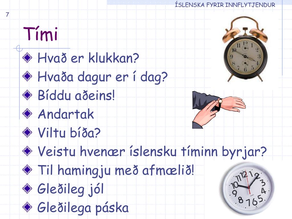 ÍSLENSKA FYRIR INNFLYTJENDUR Tími • Hvað er klukkan? • Hvaða dagur er í dag? • Bíddu aðeins! • Andartak • Viltu bíða? • Veistu hvenær íslensku tíminn byrjar? • Til hamingju með afmælið! • Gleðileg jól • Gleðilega páska
