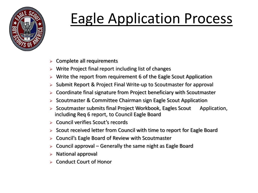 Eagle Application Process • Complete all requirements • Write Project final report including list of changes • Write the report from requirement 6 of the Eagle Scout Application • Submit Report & Project Final Write-up to Scoutmaster for approval • Coordinate final signature from Project beneficiary with Scoutmaster • Scoutmaster & Committee Chairman sign Eagle Scout Application • Scoutmaster submits final Project Workbook, Eagles Scout Application, including Req 6 report, to Council Eagle Board • Council verifies Scout’s records • Scout received letter from Council with time to report for Eagle Board • Council’s Eagle Board of Review with Scoutmaster • Council approval – Generally the same night as Eagle Board • National approval • Conduct Court of Honor