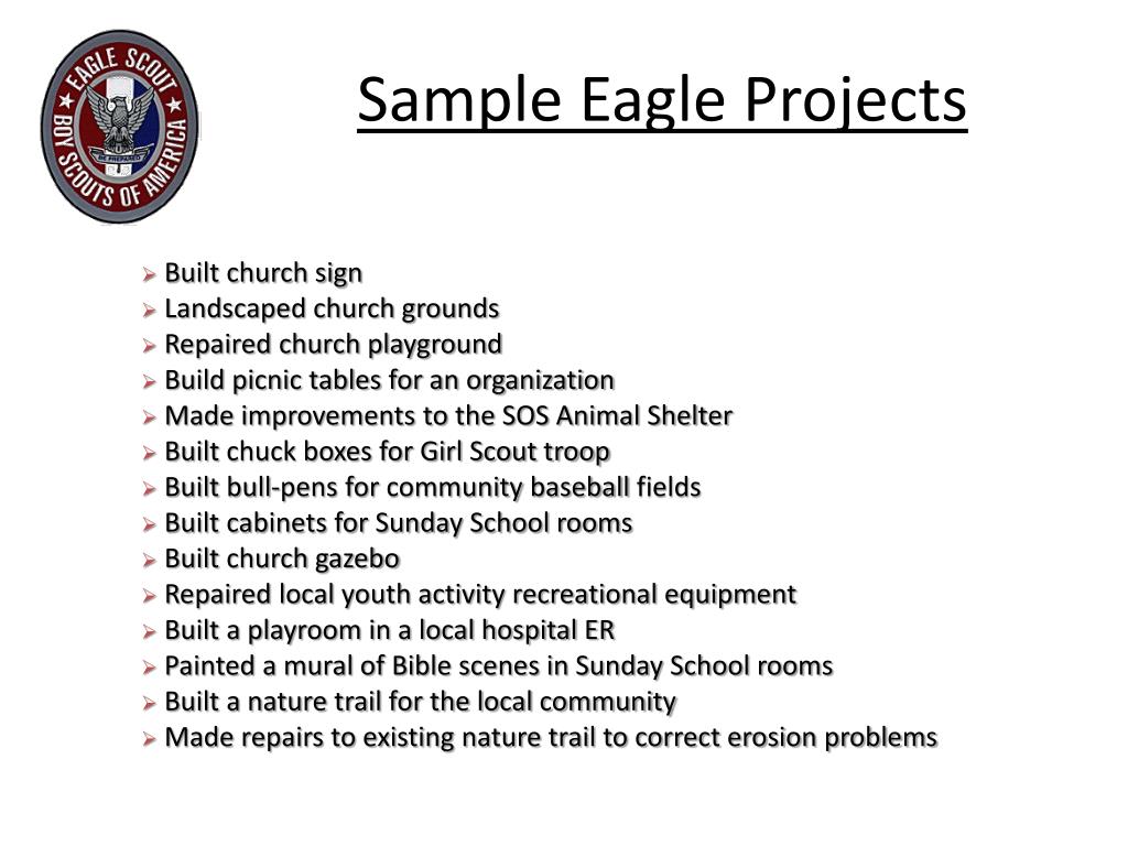 Sample Eagle Projects • Built church sign • Landscaped church grounds • Repaired church playground • Build picnic tables for an organization • Made improvements to the SOS Animal Shelter • Built chuck boxes for Girl Scout troop • Built bull-pens for community baseball fields • Built cabinets for Sunday School rooms • Built church gazebo • Repaired local youth activity recreational equipment • Built a playroom in a local hospital ER • Painted a mural of Bible scenes in Sunday School rooms • Built a nature trail for the local community • Made repairs to existing nature trail to correct erosion problems