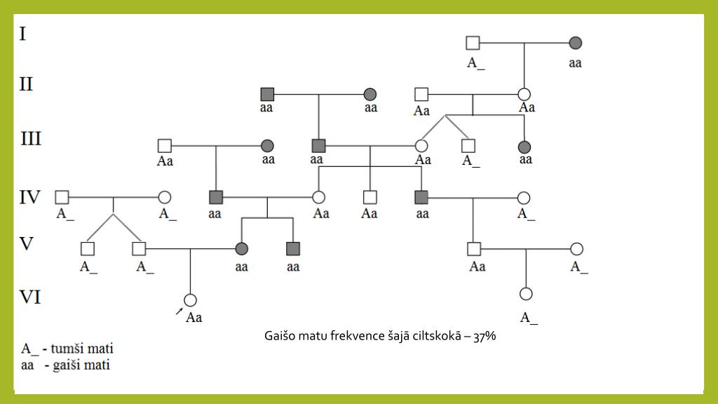 Ciltskoka analīze Matu krāsa. Alma Eihentāle ae11032. Recesīvā pazīme – gaiša matu krāsa. Matu krāsu nosaka eimelanīna un feomelanīna daudzums. Gaišo matu frekvence šajā ciltskokā – 37%. AA 1/3 p 2 /(p 2 +2pq)=0,25/(0,25+2*0,5*0,5)=0,(3)=1/3 Aa 2/3