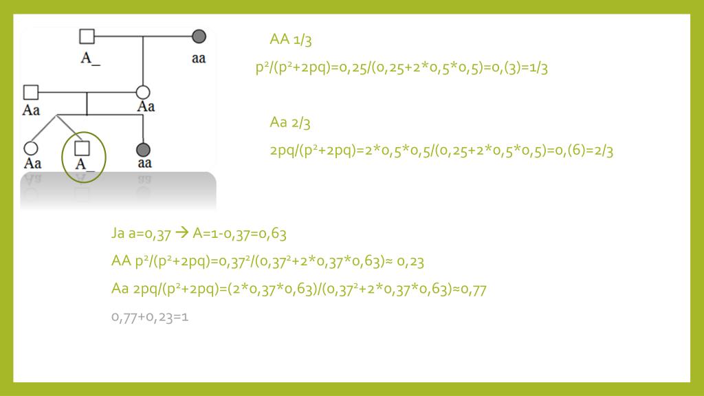 AA 1/3 p2/(p2+2pq)=0,25/(0,25+2*0,5*0,5)=0,(3)=1/3 Aa 2/3 2pq/(p2+2pq)=2*0,5*0,5/(0,25+2*0,5*0,5)=0,(6)=2/3 Ja a=0,37 A=1-0,37=0,63 AA p2/(p2+2pq)=0,372/(0,372+2*0,37*0,63)≈ 0,23 Aa 2pq/(p2+2pq)=(2*0,37*0,63)/(0,372+2*0,37*0,63)≈0,77 0,77+0,23=1