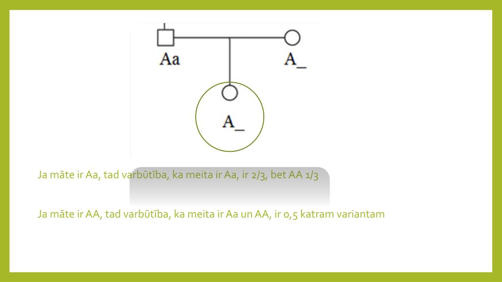 Ja māte ir Aa, tad varbūtība, ka meita ir Aa, ir 2/3, bet AA 1/3 Ja māte ir AA, tad varbūtība, ka meita ir Aa un AA, ir 0,5 katram variantam