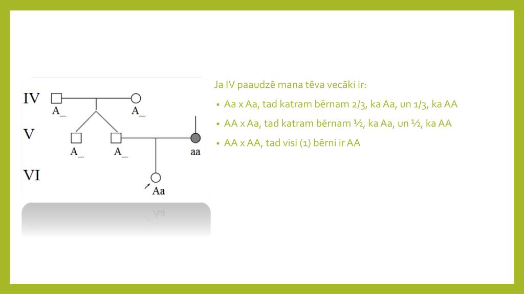 Ja IV paaudzē mana tēva vecāki ir: • Aa x Aa, tad katram bērnam 2/3, ka Aa, un 1/3, ka AA • AA x Aa, tad katram bērnam ½, ka Aa, un ½, ka AA • AA x AA, tad visi (1) bērni ir AA