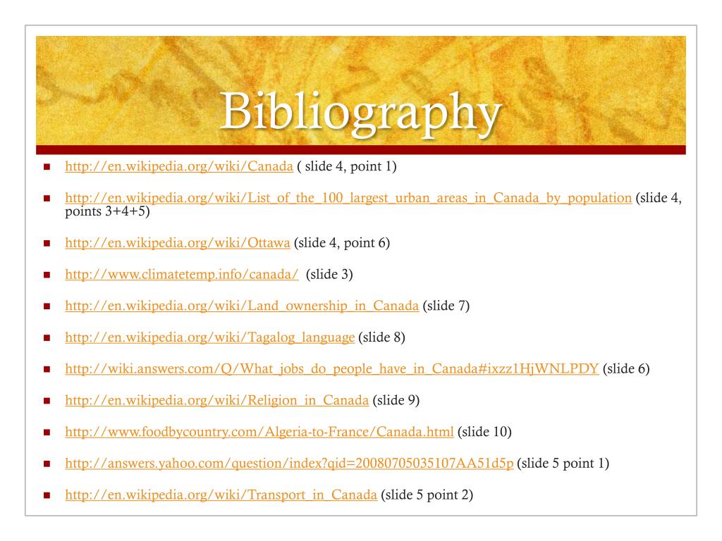 Bibliography • http://en.wikipedia.org/wiki/Canada ( slide 4, point 1) • http://en.wikipedia.org/wiki/List_of_the_100_largest_urban_areas_in_Canada_by_population (slide 4, points 3+4+5) • http://en.wikipedia.org/wiki/Ottawa (slide 4, point 6) • http://www.climatetemp.info/canada/ (slide 3) • http://en.wikipedia.org/wiki/Land_ownership_in_Canada (slide 7) • http://en.wikipedia.org/wiki/Tagalog_language (slide 8) • http://wiki.answers.com/Q/What_jobs_do_people_have_in_Canada#ixzz1HjWNLPDY (slide 6) • http://en.wikipedia.org/wiki/Religion_in_Canada (slide 9) • http://www.foodbycountry.com/Algeria-to-France/Canada.html (slide 10) • http://answers.yahoo.com/question/index?qid=20080705035107AA51d5p (slide 5 point 1) • http://en.wikipedia.org/wiki/Transport_in_Canada (slide 5 point 2)