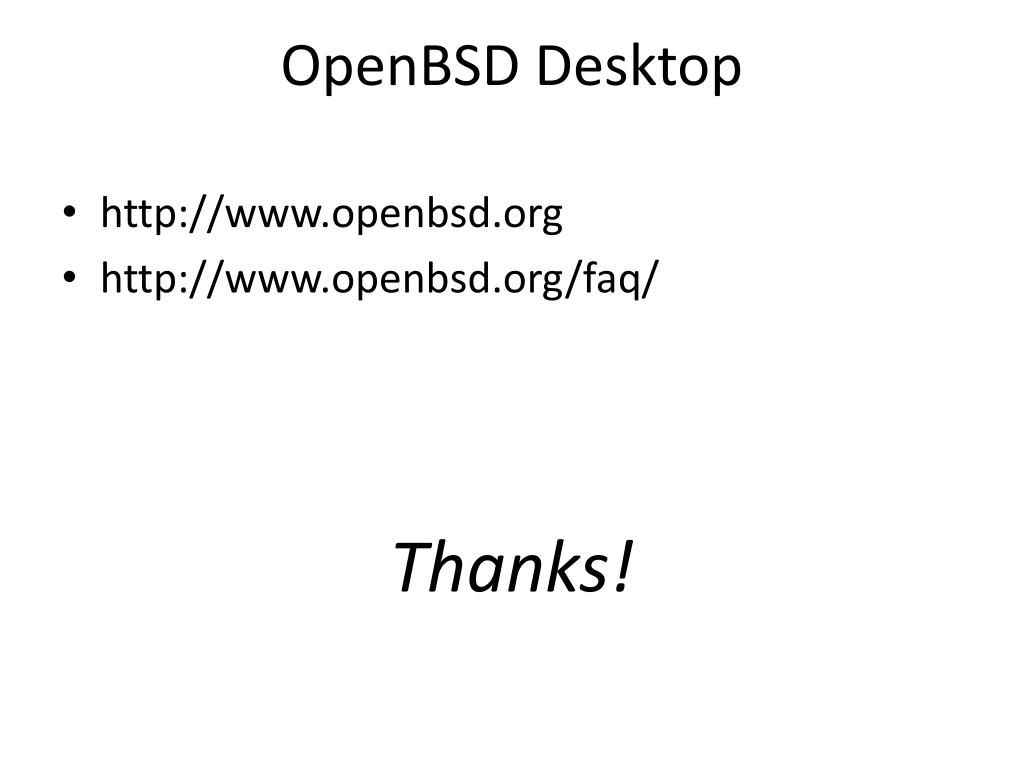 OpenBSD Desktop • http://www.openbsd.org • http://www.openbsd.org/faq/ Thanks!