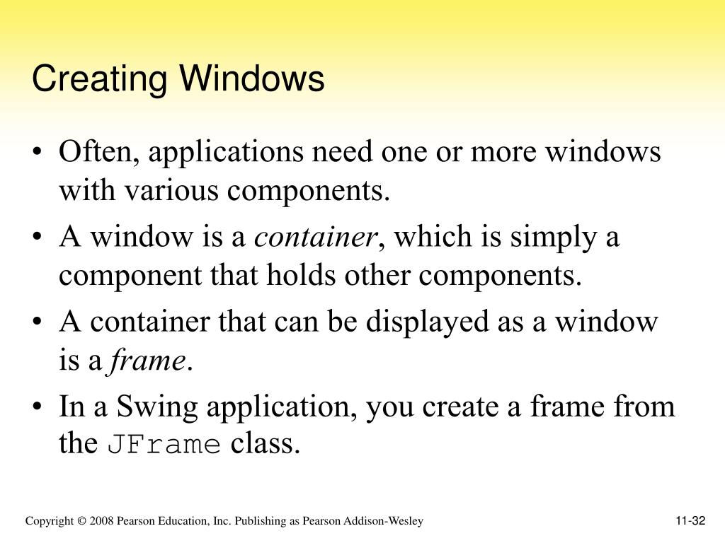 Creating Windows • The following code displays the window: window.setVisible(true); • The setVisible method takes a boolean argument. • true - display the window. • false - hide the window.