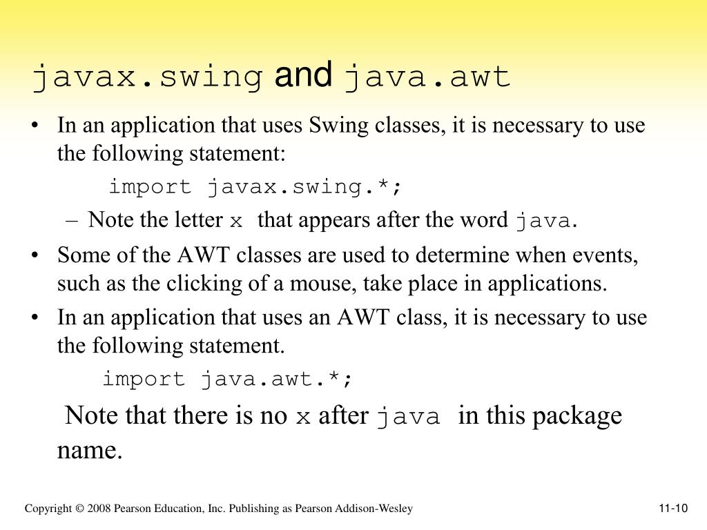 javax.swing and java.awt • In an application that uses Swing classes, it is necessary to use the following statement: import javax.swing.*; • Note the letterxthat appears after the wordjava. • Some of the AWT classes are used to determine when events, such as the clicking of a mouse, take place in applications. • In an application that uses an AWT class, it is necessary to use the following statement. import java.awt.*; Note that there is nox after javain this package name.
