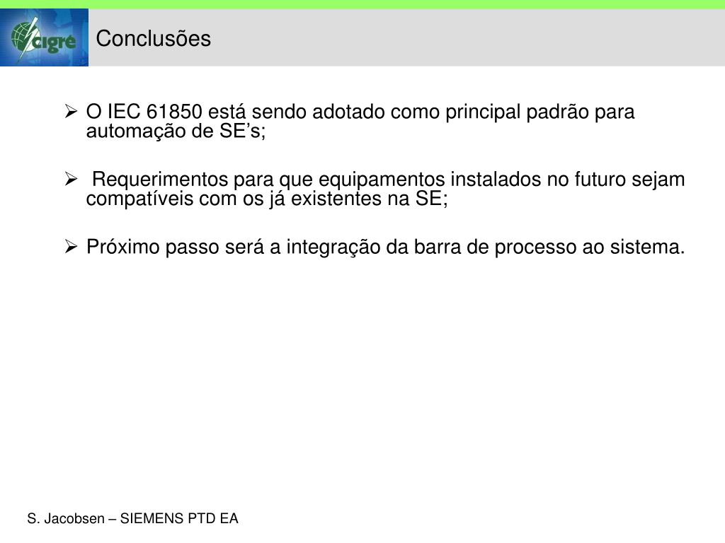 Conclusões • O IEC 61850 está sendo adotado como principal padrão para automação de SE’s; • Requerimentos para que equipamentos instalados no futuro sejam compatíveis com os já existentes na SE; • Próximo passo será a integração da barra de processo ao sistema.