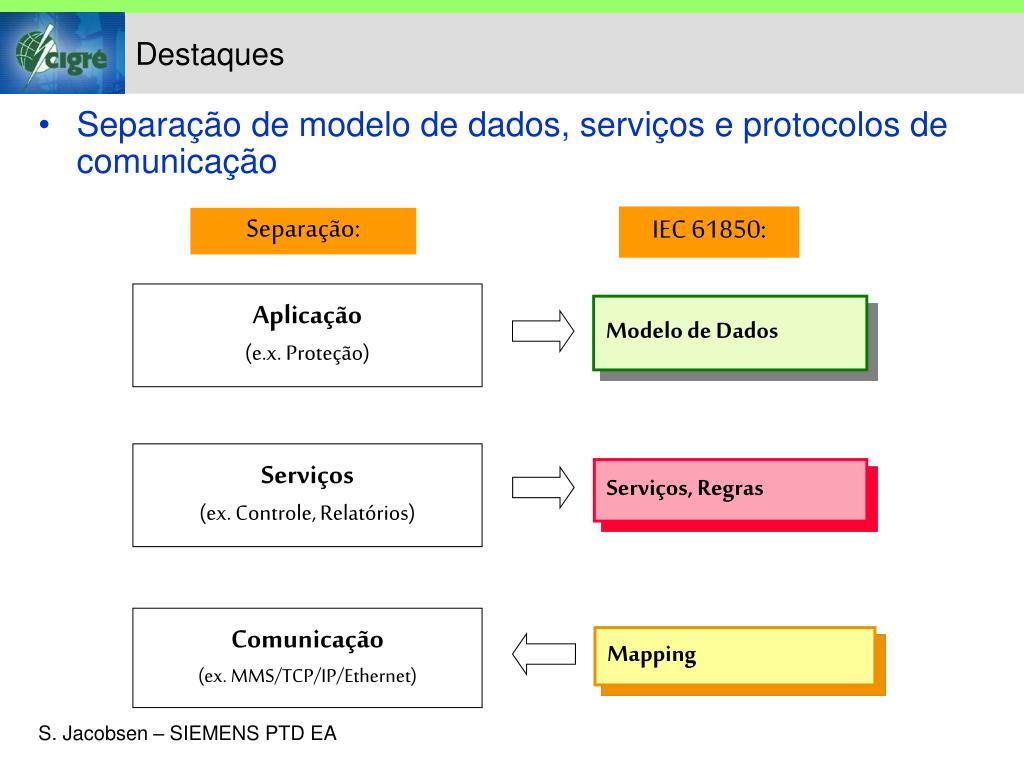 Modelo de Dados Serviços, Regras Mapping Destaques • Separação de modelo de dados, serviços e protocolos de comunicação IEC 61850: Separação: Aplicação(e.x. Proteção) Serviços(ex. Controle, Relatórios) Comunicação(ex. MMS/TCP/IP/Ethernet)
