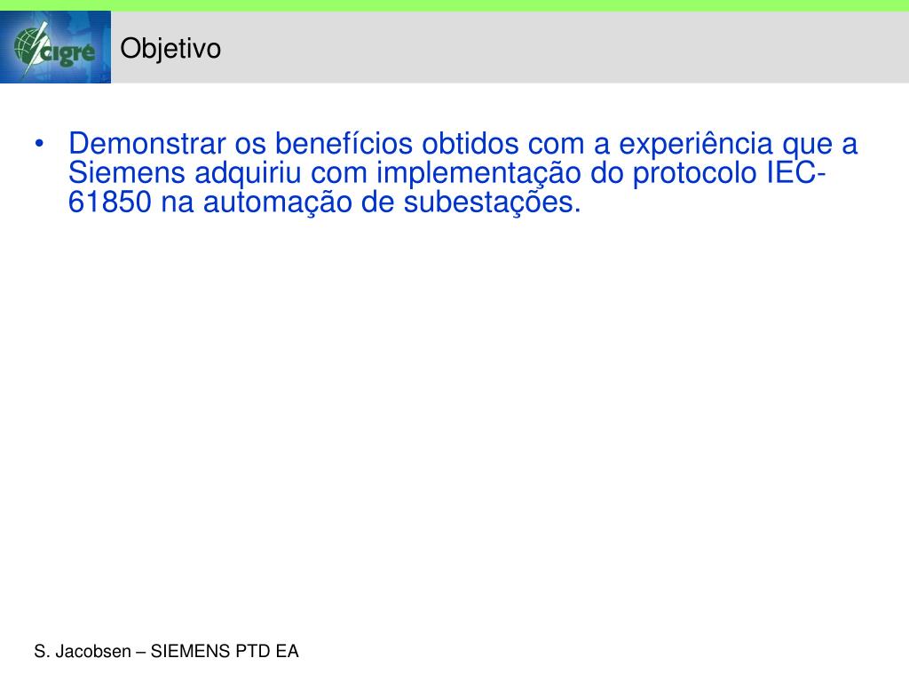 Objetivo • Demonstrar os benefícios obtidos com a experiência que a Siemens adquiriu com implementação do protocolo IEC-61850 na automação de subestações.