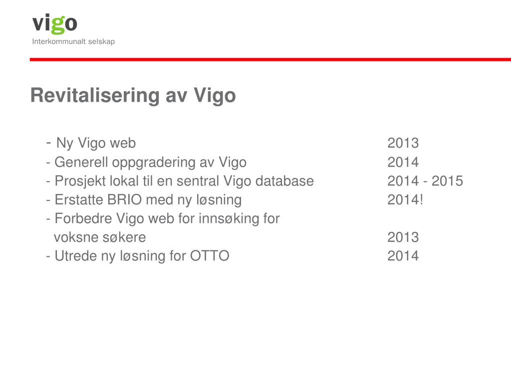 Revitalisering av Vigo - Ny Vigo web 2013 - Generell oppgradering av Vigo 2014 - Prosjekt lokal til en sentral Vigo database 2014 - 2015 - Erstatte BRIO med ny løsning 2014! - Forbedre Vigo web for innsøking for voksne søkere 2013 - Utrede ny løsning for OTTO 2014