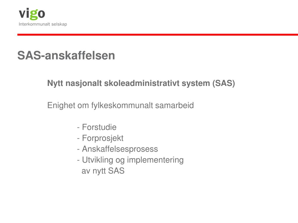 SAS-anskaffelsen Nytt nasjonalt skoleadministrativt system (SAS) Organisering Overordnet ansvar Vigo IKS Styringsgruppe - Konsulentfirma Ernst & Young - Kjerneteamet - Fylkesteamene - Sentralt mottak- og implementeringsprosjekt - Lokalt mottak- og implementeringsprosjekt