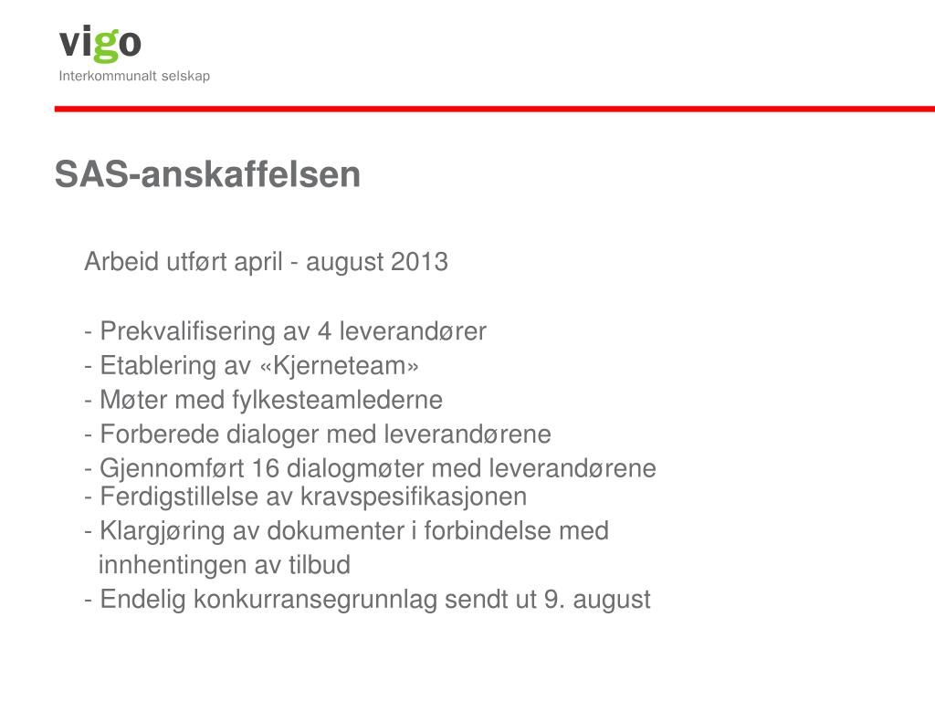 SAS-anskaffelsen Fremdriftsplan - Etablere et «Sentralt mottak- og implementeringsprosjekt» - Produksjon av en «Innføringshåndbok» - Tilbudsåpning 23. september - Evaluering av tilbudene, 4 uker - Valg av leverandør 24. – 31.oktober - Undertegning av Rammeavtale Vigo IKS - november - Oppstart av SAS arbeidet, årsskifte!