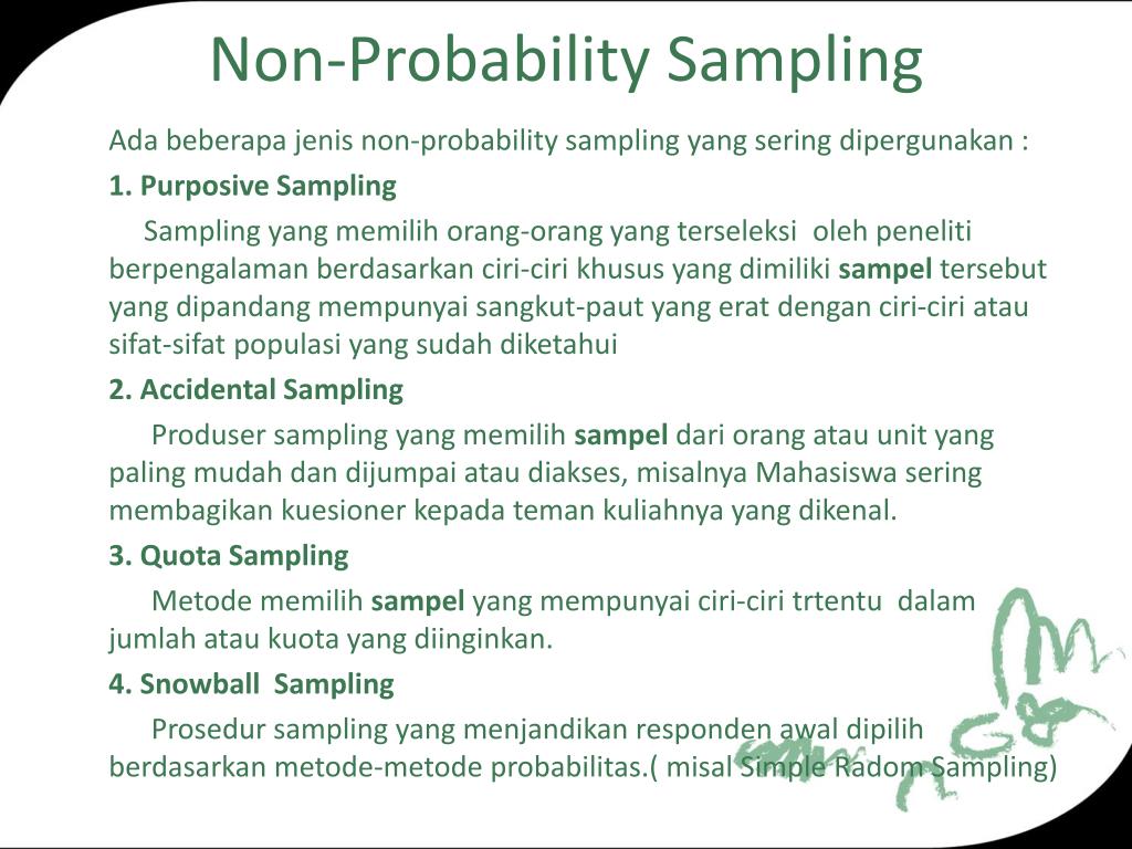 Non-Probability Sampling Ada beberapa jenis non-probability sampling yang sering dipergunakan : 1. Purposive Sampling Sampling yang memilih orang-orang yang terseleksi oleh peneliti berpengalaman berdasarkan ciri-ciri khusus yang dimiliki sampel tersebut yang dipandang mempunyai sangkut-paut yang erat dengan ciri-ciri atau sifat-sifat populasi yang sudah diketahui 2. Accidental Sampling Produser sampling yang memilih sampel dari orang atau unit yang paling mudah dan dijumpai atau diakses, misalnya Mahasiswa sering membagikan kuesioner kepada teman kuliahnya yang dikenal. 3. Quota Sampling Metode memilih sampel yang mempunyai ciri-ciri trtentu dalam jumlah atau kuota yang diinginkan. 4. Snowball Sampling Prosedur sampling yang menjandikan responden awal dipilih berdasarkan metode-metode probabilitas.( misal Simple Radom Sampling)