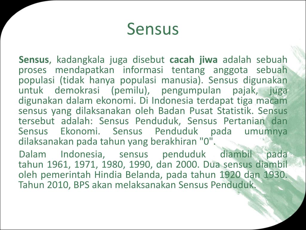 Sensus Sensus, kadangkala juga disebut cacah jiwa adalah sebuah proses mendapatkan informasi tentang anggota sebuah populasi (tidak hanya populasi manusia). Sensus digunakan untuk demokrasi (pemilu), pengumpulan pajak, juga digunakan dalam ekonomi. Di Indonesia terdapat tiga macam sensus yang dilaksanakan oleh Badan Pusat Statistik. Sensus tersebut adalah: Sensus Penduduk, Sensus Pertanian dan Sensus Ekonomi. Sensus Penduduk pada umumnya dilaksanakan pada tahun yang berakhiran "0". Dalam Indonesia, sensus penduduk diambil pada tahun 1961, 1971, 1980, 1990, dan 2000. Dua sensus diambil oleh pemerintah Hindia Belanda, pada tahun 1920 dan 1930. Tahun 2010, BPS akan melaksanakan Sensus Penduduk.