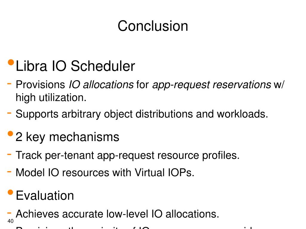 Conclusion • Libra IO Scheduler • Provisions IOallocations for app-requestreservations w/ high utilization. • Supports arbitrary object distributions and workloads. • 2 key mechanisms • Track per-tenant app-request resource profiles. • Model IO resources with Virtual IOPs. • Evaluation • Achieves accurate low-level IO allocations. • Provisions the majority of IO resources over a wide range of workloads • Satisfies app-request reservations w/ high utilization.