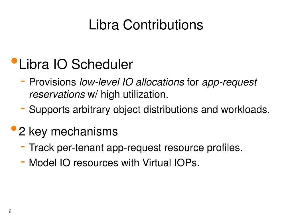Libra Contributions • Libra IO Scheduler • Provisions low-level IOallocations for app-requestreservations w/ high utilization. • Supports arbitrary object distributions and workloads. • 2 key mechanisms • Track per-tenant app-request resource profiles. • Model IO resources with Virtual IOPs.