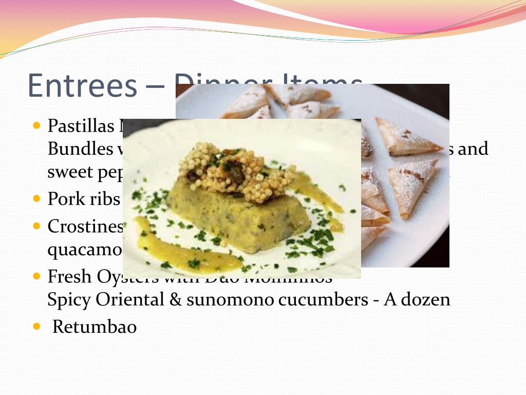Entrees – Dinner Items • Pastillas Moroccan Bundles with organic chicken massala, Brazil nuts and sweet pepper. Served with fresh yogurt with mint. • Pork ribs with sour pineapple and spices. • Crostines Latino Grilled Shrimp and Squid quacamole with olive oil and pepper • Fresh Oysters with Duo MolhinhosSpicy Oriental & sunomono cucumbers - A dozen • Retumbao