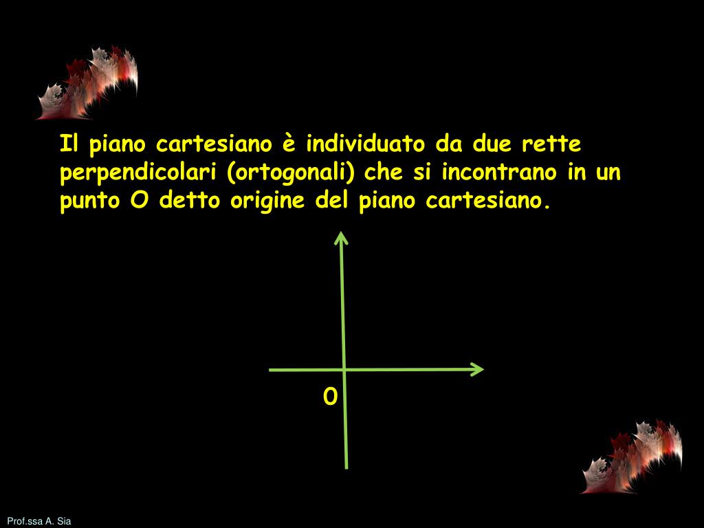 Il piano cartesiano è individuato da due rette perpendicolari (ortogonali) che si incontrano in un punto O detto origine del piano cartesiano. 0