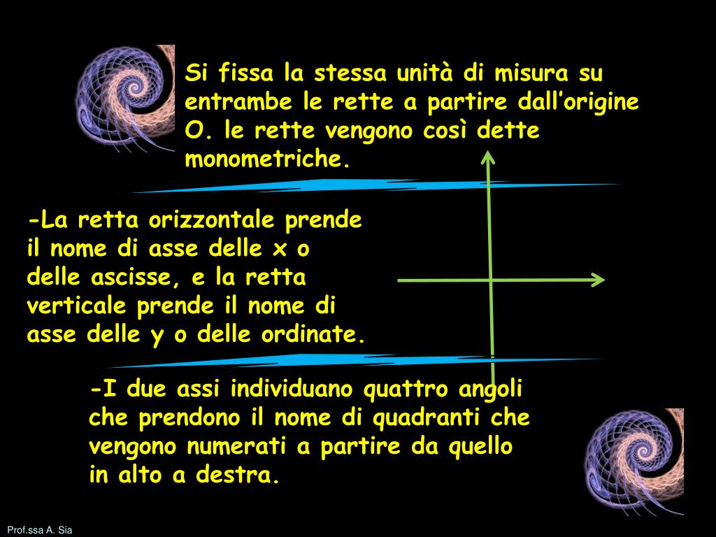 Si fissa la stessa unità di misura su entrambe le rette a partire dall’origine O. le rette vengono così dette monometriche. -La retta orizzontale prende il nome di asse delle x o delle ascisse, e la retta verticale prende il nome di asse delle y o delle ordinate. -I due assi individuano quattro angoli che prendono il nome di quadranti che vengono numerati a partire da quello in alto a destra.a e procedendo